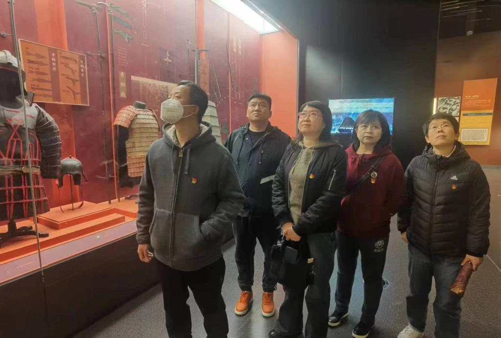 在博览园讲解员引导下,党员同志们怀着崇敬的心情先后参观了赤水职业学校校史馆、综合楼展室、国防教育馆。在赤水职业学校校史馆,他们一边认真聆听讲解员的详细解说,一边驻足观看书籍、照片、遗物等珍贵史料。通过展馆内一件件物品,一幅幅感人至深的图片和一个个生动真实的故事,了解了渭南地区的历史人物事迹、军事战例和“毛泽东忠诚卫士,共和国开国元勋”张宗逊将军的光辉功绩。在综合楼展室、国防教育馆,讲解员以兵器发展的历史为主线,功勋武器和渭南军事、历史故事为特色,引导党员同志们参观了从古至今兵器实物和模型,尤其是现代兵器和军事知识,进一步加强了对党员和职工们的爱国主义和理想信念教育,丰富了人文历史知识,学习了党的革命先辈为实现国家独立、强兵富国而忘我奋斗、鞠躬尽瘁干革命的光荣精神。