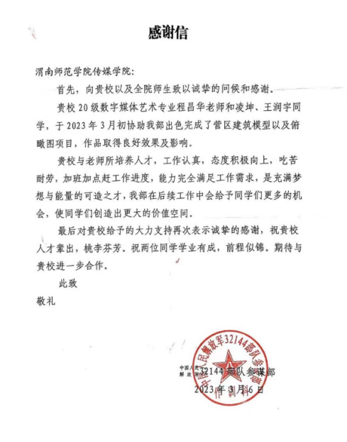 4月25日,威尼斯传媒学院收到来自中国人民解放军32144部队参谋部的感谢信,信中对传媒学院数字媒体艺术专业教师程昌华、2020级数字媒体艺术专业凌坤、王润宇同学在2023年3月初协助中国人民解放军32144部队参谋部出色完成了营区建筑模型以及俯瞰图项目取得良好效果及影响表示肯定和感谢。