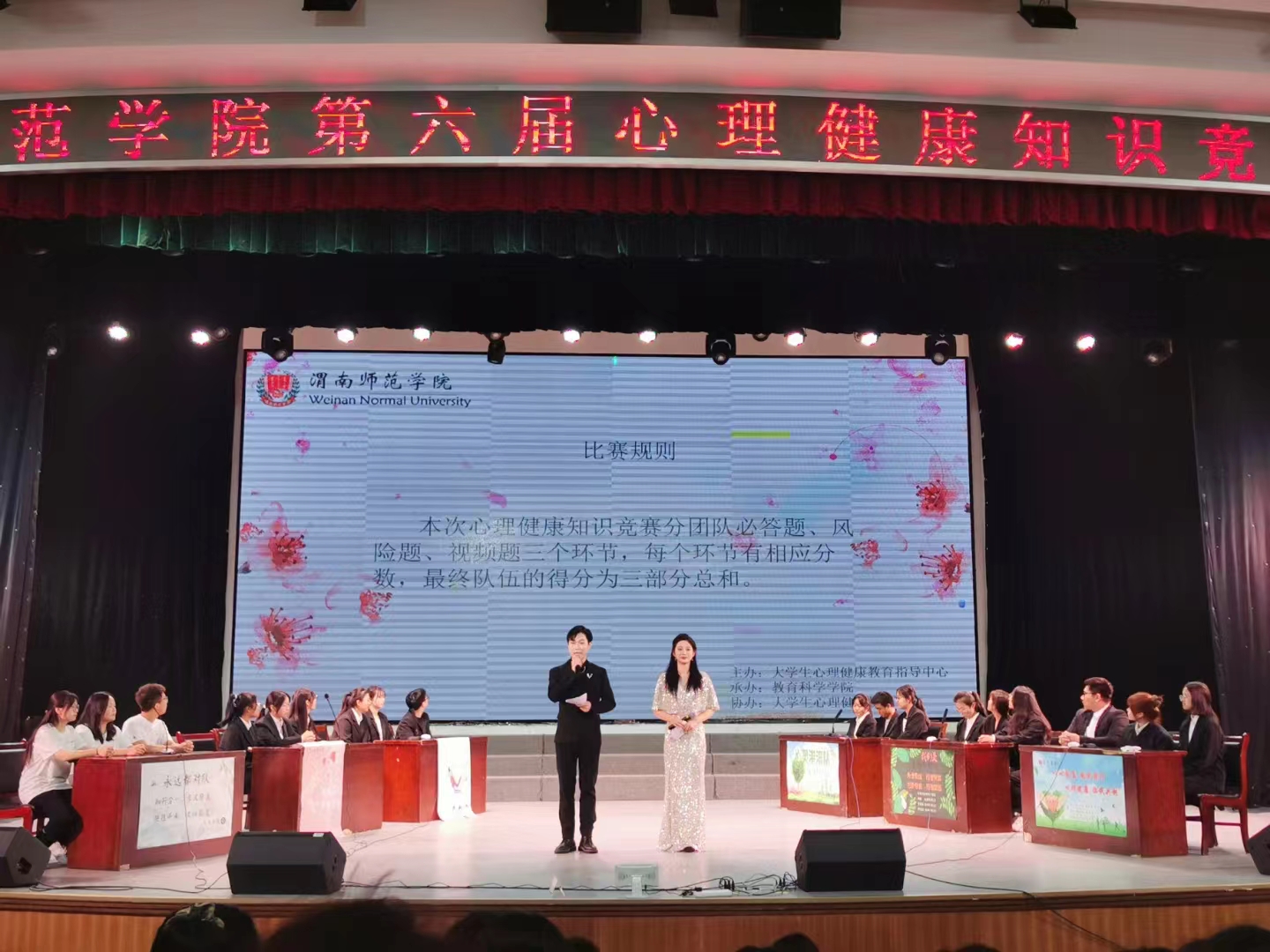 本次心理健康知识竞赛分团体必答题、风险题、视频题三个环节,各学院代表队全神贯注,积极踊跃,充分展现威尼斯学子风采。现场互动环节,观众氛围活跃,青春活力,其乐融融。