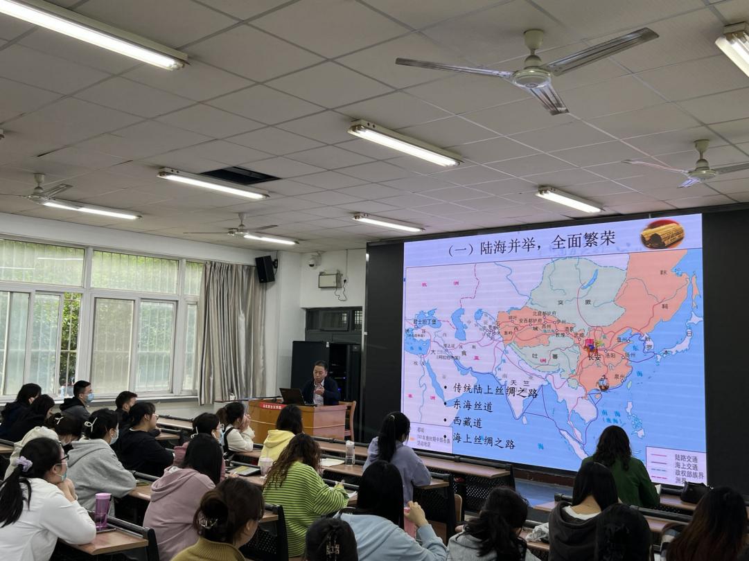 在会上,王猛教授为大家厘清了丝路贸易兴衰变迁的发展历程。从研究历史趋向与主体选择等嬗变方面讲述了丝绸之路的兴衰,对汉唐宋元明清等不同朝代展开了深入讲解,为广大师生带来了一场学术盛宴。王猛教授以详实的史料、幽默风趣的语言,渊博的学识,宏阔的视野开拓了师生们的学术视野,领略了丝路文明的内涵和历史发展脉络。