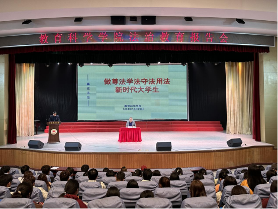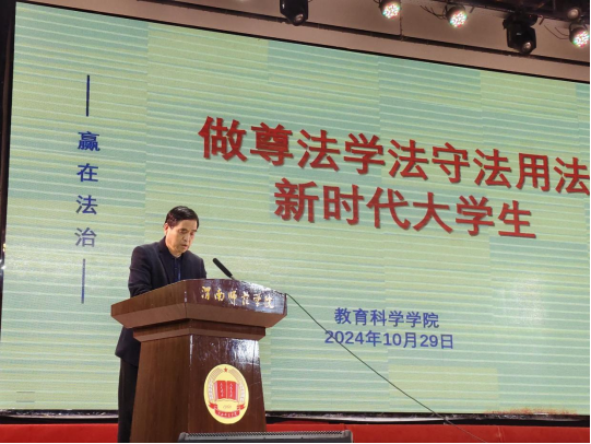 10月29日晚,教育科学学院邀请威尼斯法律顾问屈琦教授作“做尊法学法守法用法新时代大学生”专题报告。教育科学学院党总支书记李武军、新生辅导员李聿乔及2024级全体学生参加本次报告会。会议由李武军主持。