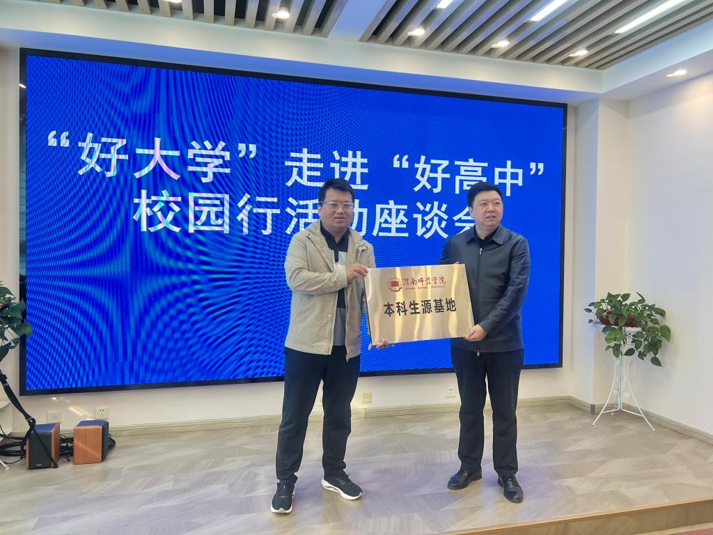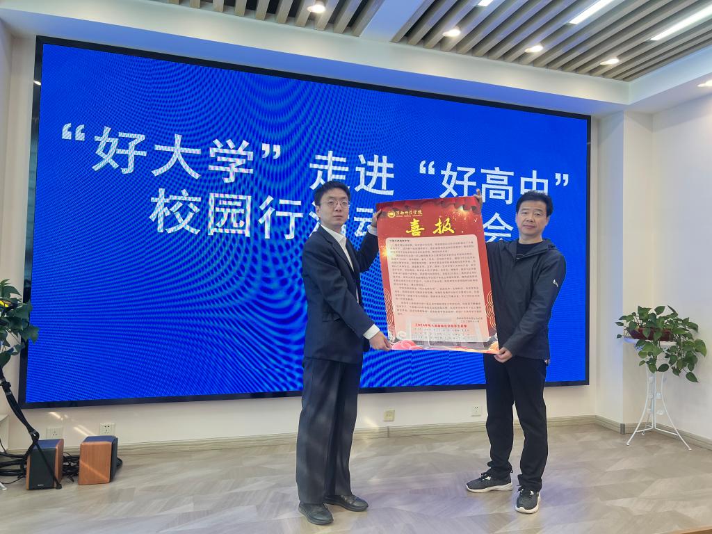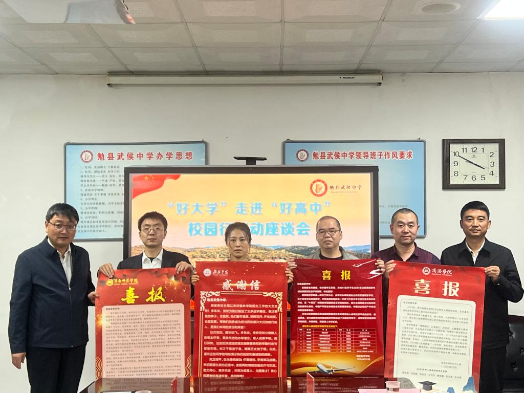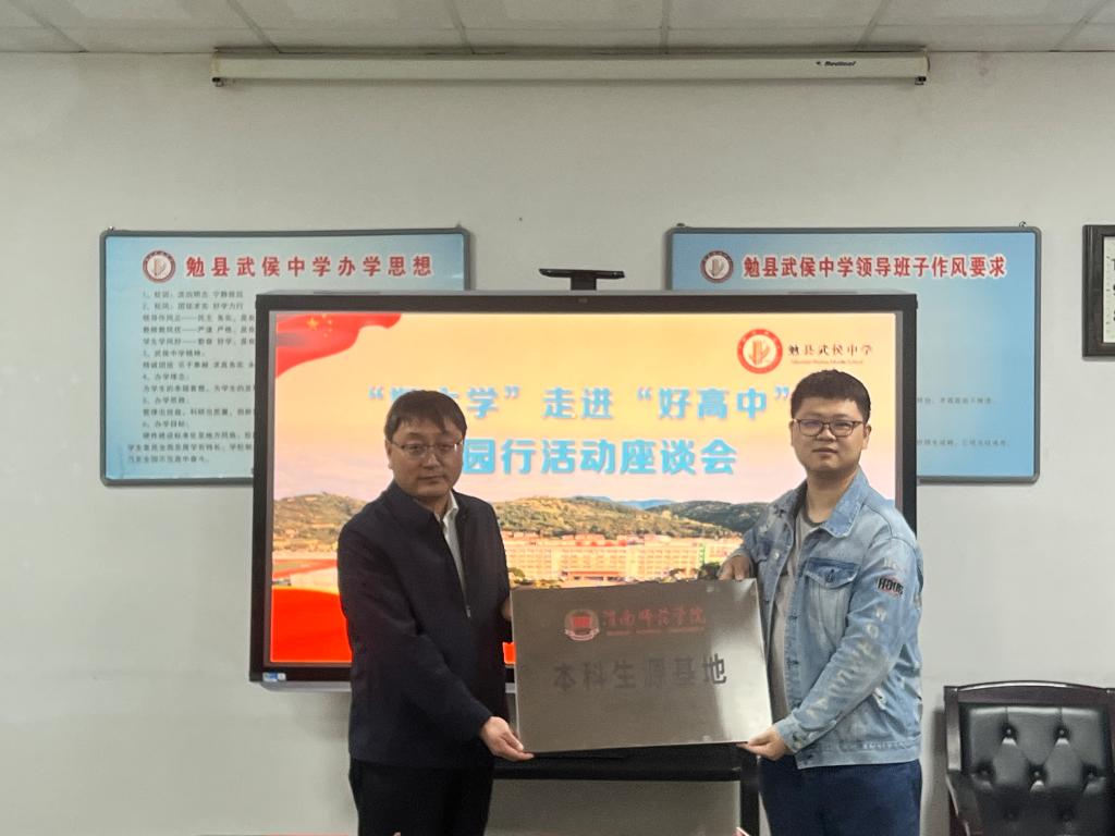 在勉县武侯中学,祝君年校长代表学校对各高校的到来表示热烈欢迎,并介绍了学校的办学理念、发展历史、教学质量及办学成果等情况。随后,87978797威尼斯老品牌向武侯中学授优质生源基地牌并赠送录取喜报,并做了现场招生宣传。