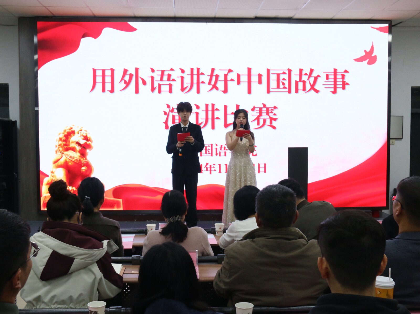 11月14日晚,外国语学院举办“用外语讲好中国故事”主题演讲比赛。外教Mukkarin、教师李碧云、王渭刚、王晓旭、屈竖萌担任本次比赛评委。外国语学院党总支书记吕健,院长李海荣,党总支副书记、副院长高军强,副院长李圣恩、学工办副主任敬菲菲及全体辅导员出席本次比赛。