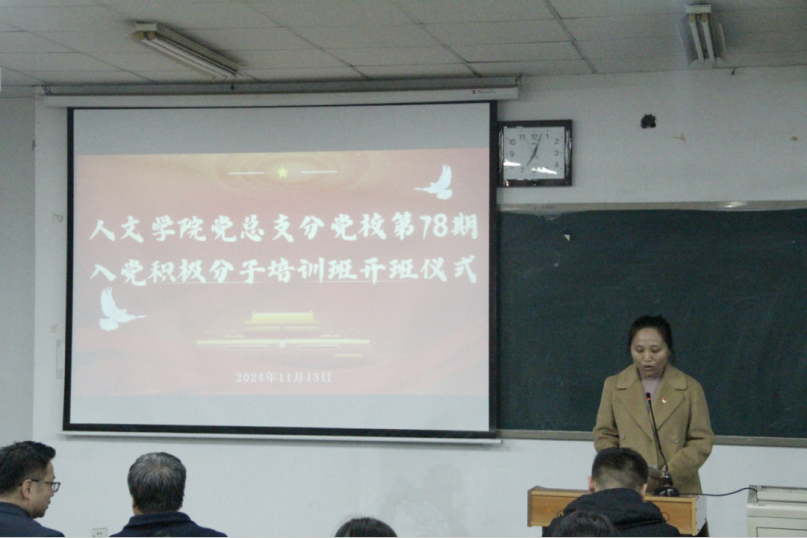 11月13日晚,人文学院分党校在博识楼1201教室举行了第78期入党积极分子培训班开班仪式。该院党总支副书记王昱,历史系主任王文涛,学生党支部书记、支委,学生党支部教师党员及60名入党积极分子参加了开班仪式,会议由该院党务秘书乔晓琼主持。