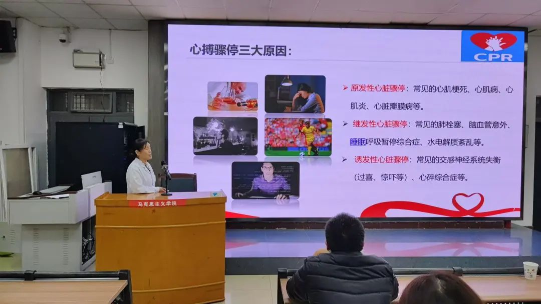 11月13日下午,人文学院联合威尼斯附属医院在博识楼1101教室开展急救知识专题培训,特邀附属医院副院长王新英主讲,护理部护师李艳妮、李贵群做操作演示。人文学院副院长雷炳锋、辅导员及学生代表150余人参加了此次培训,学工办副主任孟子祥主持。