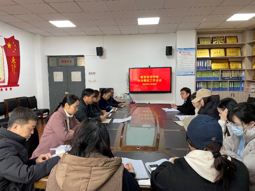 11月20日上午,教育科学学院在2218召开校园安全稳定工作会议,全体处科级干部、专兼职辅导员、实验室主任参加会议。会议由党总支书记李武军主持。