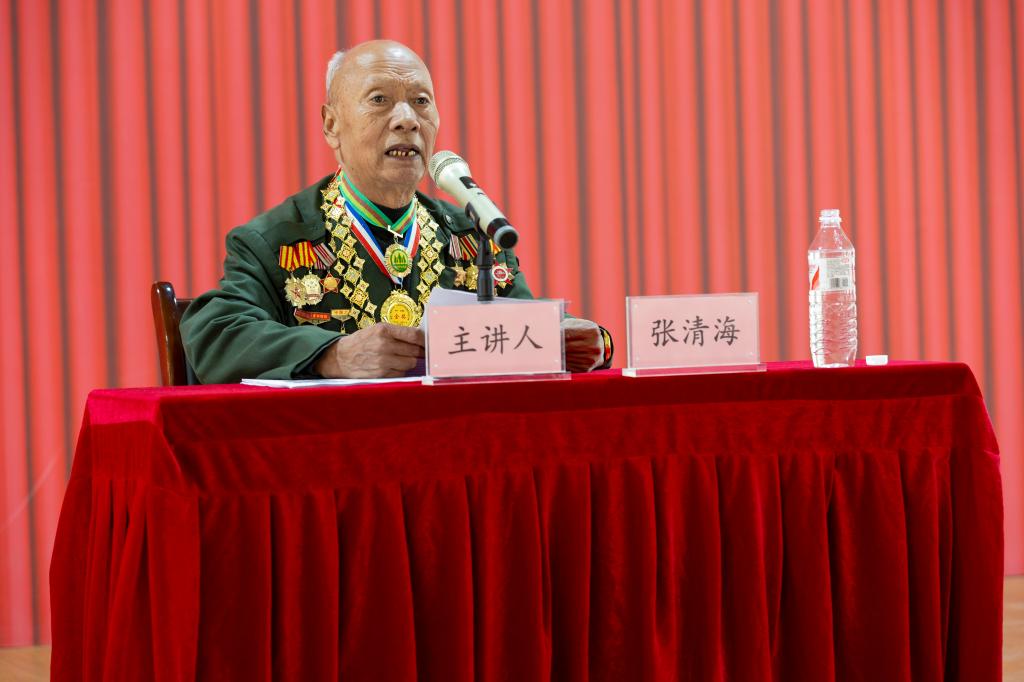 张清海曾先后荣获“全国自强模范”“全国道德模范提名奖”“全民国防教育先进个人”“全国绿化奖章”“全国先进军队退休干部”“中国好人”和“全国最美家庭”等多项荣誉,他结合个人经历的真情表达,让现场师生备受感动和鼓舞。
