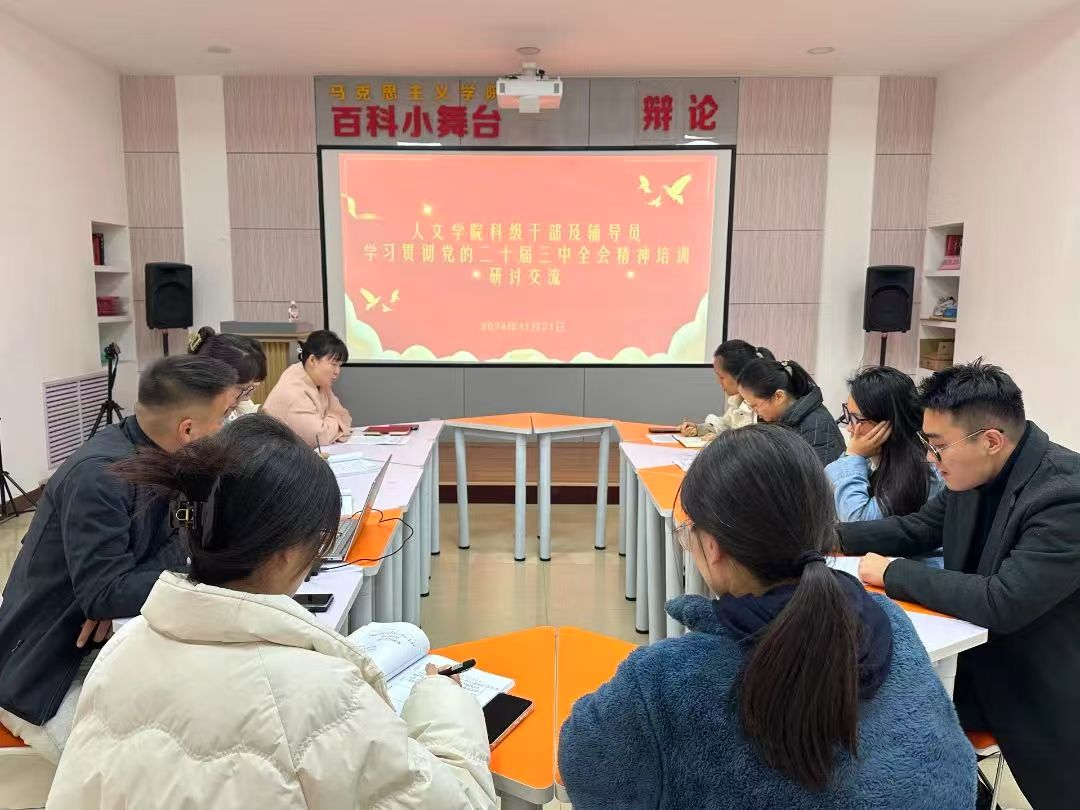 11月21日下午,人文学院党总支在博识楼1118会议室召开科级干部及辅导员学习贯彻党的二十届三中全会精神研讨交流会,学院全体科级干部、辅导员参加会议,会议由党总支书记张晶主持。