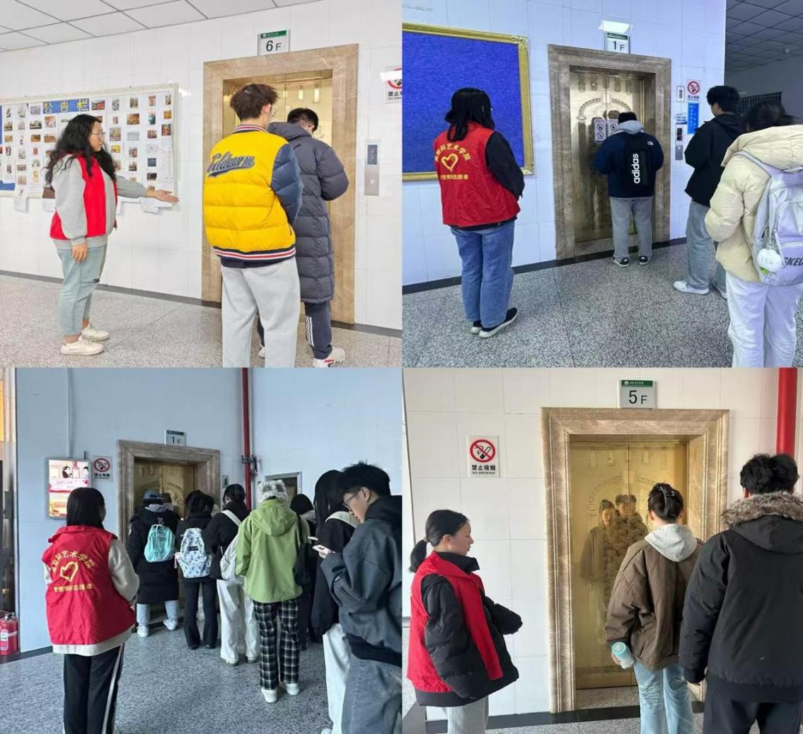 志愿者们按时按点坚守在学院各楼层电梯口,提醒大家有序乘梯、避免上课迟到,制止插队、推挤等不文明的乘梯行为,缓解了上下课高峰时期的乘梯压力,为师生们的日常教学与学习活动提供了可靠的垂直交通保障,引导师生们共同维护良好的公共秩序。