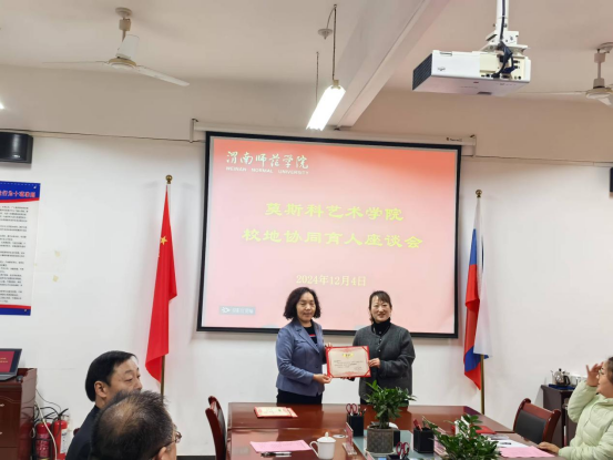 会议伊始,王争军为莫斯科艺术学院颁发了表扬信,表扬莫斯科艺术学院实习生在南塘小学90年校庆活动中作出的贡献和实习期间的突出表现。王菊霞为南塘小学优秀实习指导教师颁发荣誉证书,感谢老师们对实习生的悉心指导和帮助。