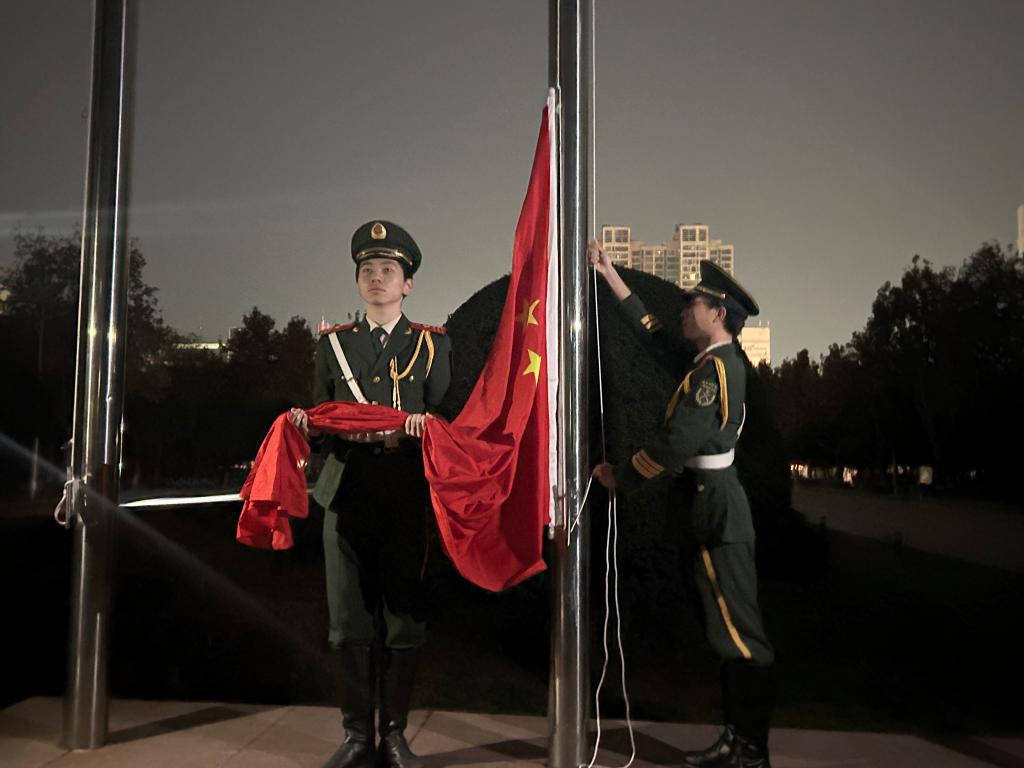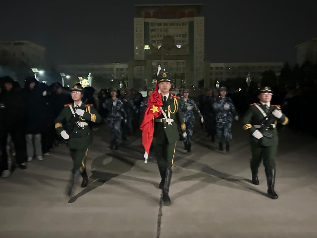 国歌奏响,师生目光炽热、庄严肃穆,五星红旗冉冉升起,爱国豪情与体育精神在此刻交融。