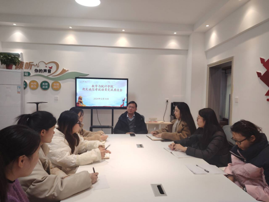 12月10日,数学与统计学院在学校10号楼“一站式”学生社区服务中心开展期末诚信考试交流座谈会,院长陈斌、辅导员张洁荣与10名学生参加座谈会。