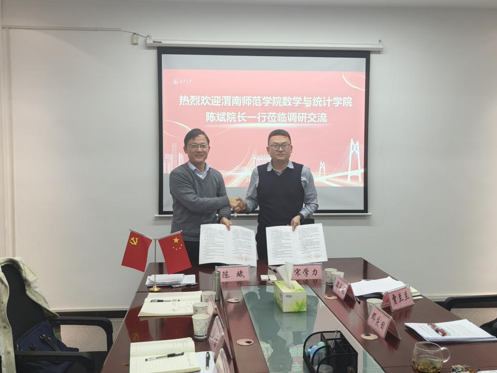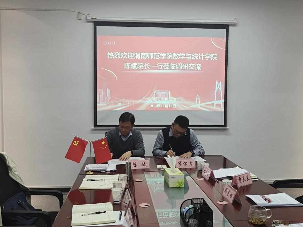 12月19日下午,数学与统计学院院长陈斌一行5人前往长安大学理学院进行调研交流,此次调研重点围绕本科教育教学审核评估和研究生联合培养两大主题展开。