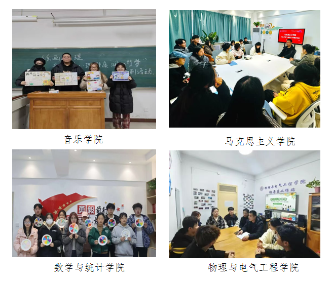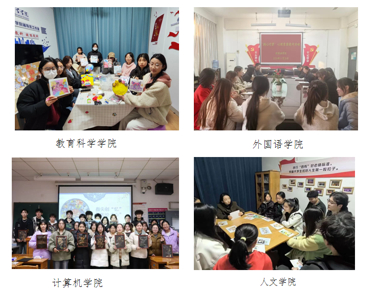 活动期间,二级学院结合学院专业特点开展了一系列具有学院特色的品牌活动,环境与生命科学学院开展了“心灵曼陀罗,艺术疗愈行”心理绘画沙龙、传媒学院开展了“润心竹梦”非遗漆扇体验活动、化学与材料学院开展了“指尖创艺,心暖向阳”“润心竹梦”心理素质提升手工活动,体育学院开展了“一站式”学生社区“润心竹梦”心理健康手抄报沙龙、教育科学学院开展了“润心竹梦”塑造情绪,指尖上的多彩心情活动,外国语学院开展了“润心竹梦”学生代表座谈会、计算机学院开展了指尖创“忆”,箔影绘“心”DIY活动、人文学院开展了“润心竹梦-循着家族故事,解锁藏在岁月里的精神原力”心理沙龙活动、数学与统计学院开展“润心竹梦”情绪转盘手绘活动、音乐学院开展了“润心竹梦”绘画心理健康系列活动、马克思主义学院了开展“润心竹梦”心理育人专题座谈会、美术学院开展了“一站式”“吾画吾心 一心向阳”心理漫画主题活动、莫斯科艺术学院开展了“润心竹梦”“手画我心,直抒心艺”心理绘画活动、经济与管理学院开展了“一站式”心有阳光,我绘我心手抄报比赛、物理与电气工程学院开展了“一站式”学生社区心理委员培训活动。