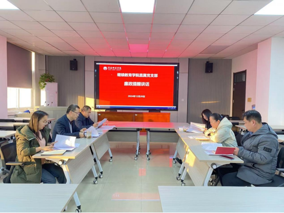 12月20日下午,继续教育学院直属党支部开展廉政提醒谈话,学院党员干部参加,直属党支部书记周德锋主持会议。