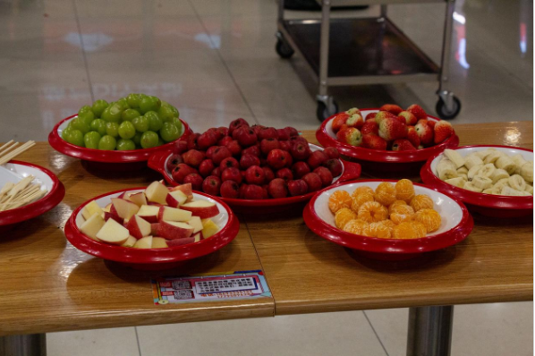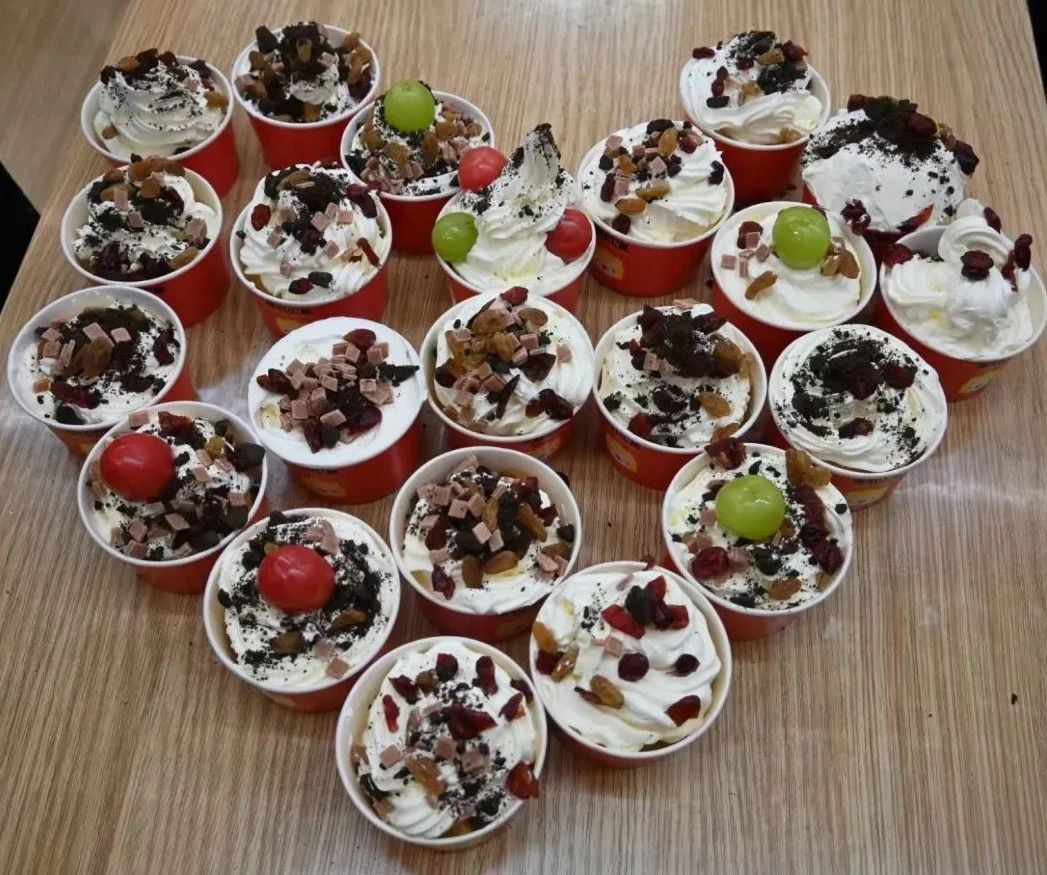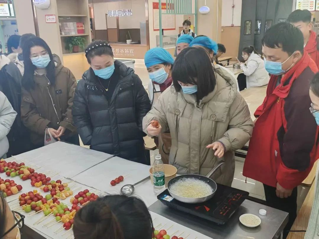 DIY 活动中,食堂厨师耐心指导师生穿糖葫芦串、熬糖浆、裹糖浆,小蛋糕打奶油、布置水果、装饰造型,学生认真学习、巧思研究糖葫芦的色彩搭配、小蛋糕的外形装饰。活动小组分工协作、交流互通,增强团队凝聚力,增进师生友谊和互动,营造和谐美好的校园文化氛围。