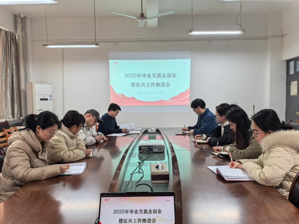 2月25日下午,物理与电气工程学院在2418会议室召开2025年毕业生就业创业暨征兵工作推进会。学院党总支书记袁卫、院长张修兴、党总支副书记权轻舟、全体辅导员参会。