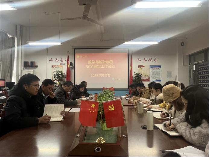 3月3日下午,数学与统计学院召开安全稳定工作会议。会议旨在传达学校安全稳定工作会议精神,进一步落实安全稳定工作责任,确保学院各项工作平稳有序进行。全体行政人员参加会议,会议由党总支书记武江波主持。