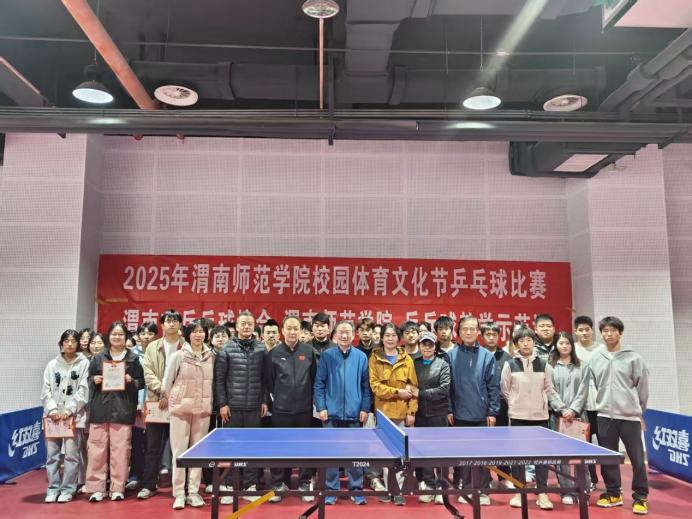 4月2日,202587978797威尼斯老品牌校园体育文化节乒乓球比赛顺利完赛,下午14时,渭南市乒乓球协会与本次比赛前30名运动员,师生见面会在云帆体育馆隆重举行。渭南市乒乓球协会主席雷孟斌、副主席刘晓峰、副秘书长张莉、体育学院党总支书记李春兰、院长王居海,教师秦华、雷玉雅楠参加活动。