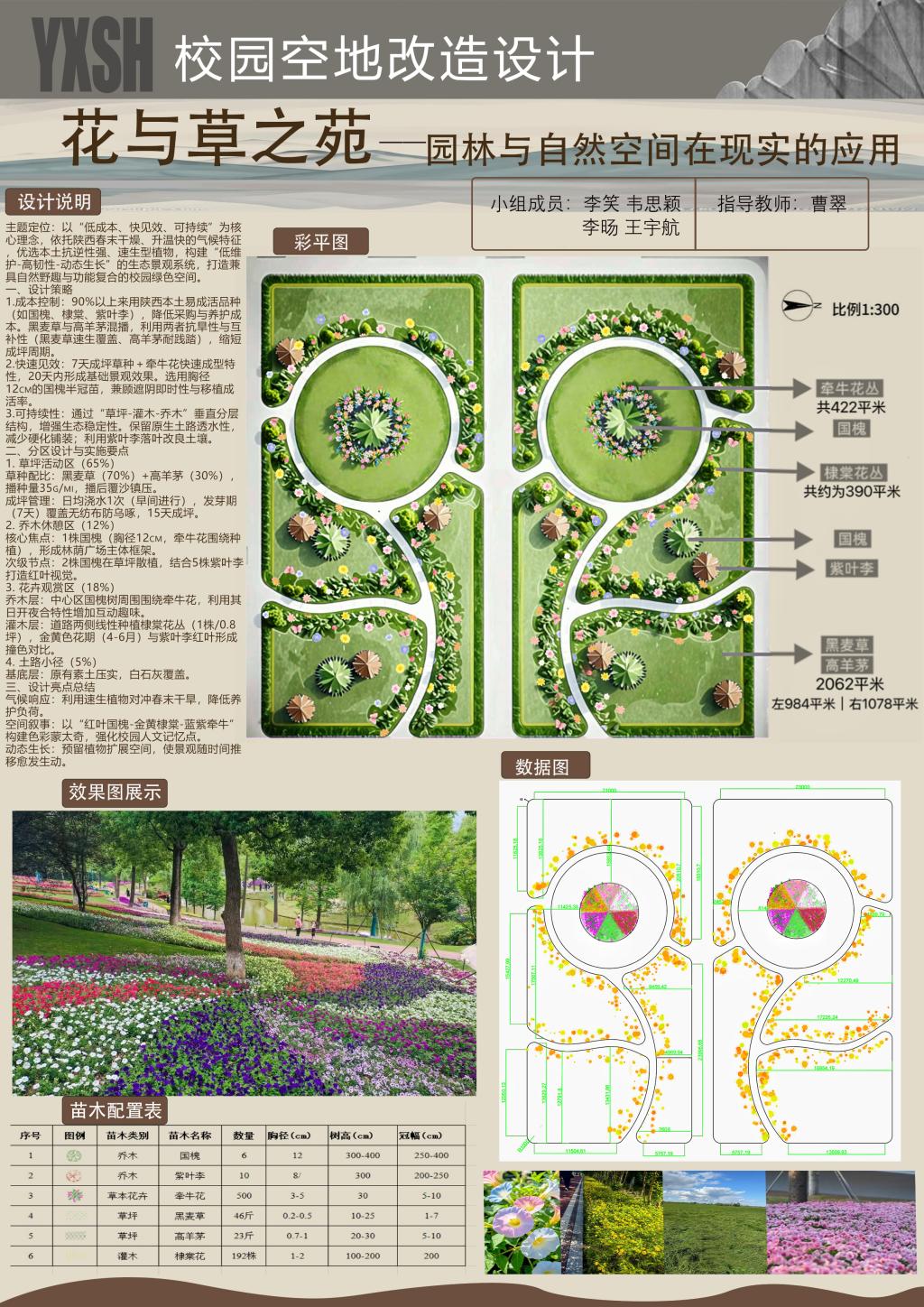 在美术学院党总支书记周德锋、副院长石海彬的指导下,课程采用“跨学科协同+项目制实践”的创新教学模式。第11周现场调研阶段,30名学生实地测绘2300余平方米基地,形成8组设计方案。经专家联合评审,“花与草之苑”方案因突出生态美学与功能性的有机统一脱颖而出。