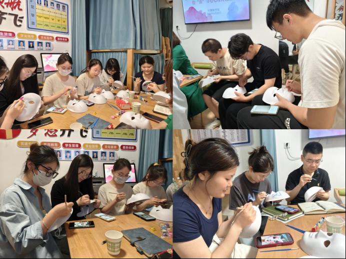 活动现场,色彩缤纷的颜料、造型各异的面具整齐摆放,充满艺术氛围。一个个独具特色的面具在同学们的手中诞生,每一个面具都承载着独特的情感和故事。同学们相互展示自己的作品,分享创作背后的心路历程,现场气氛热烈而融洽。