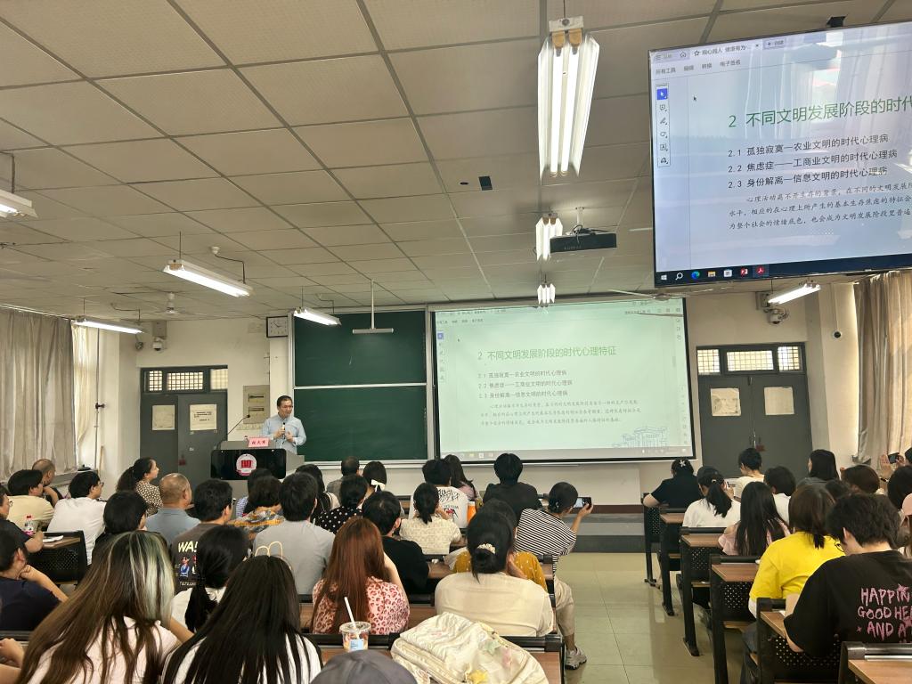 6月24日下午,教育科学学院特邀西安终南心理首席督导师、陕西省人民医院心理科主任医师张天布在知新楼2501作题为“观心阅人 健康有为”的专题报告。心理学专业师生、渭南市精神卫生中心和渭南市中心医院相关医师、渭南市青少年心理健康教育分会部分代表、渭南中小学心理辅导教师代表参与聆听,报告由教育科学学院副院长马雅菊主持。