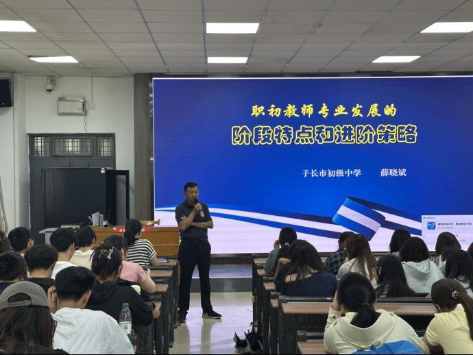 6月26日下午,子长市初级中学校长、陕西省教学能手薛晓斌在1101教室为思想政治教育专业23级学生做题为《职初教师专业发展的阶段特点和进阶策略》的报告会。报告会由思想政治教育专业教师孙晓珍主持。