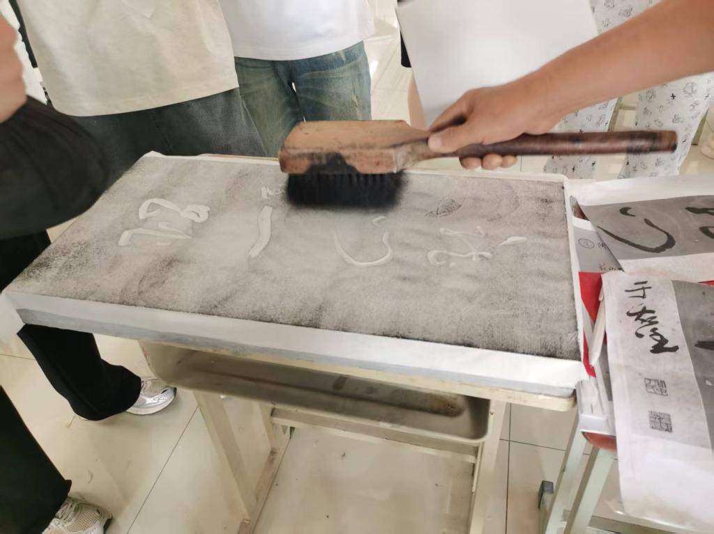 当天下午进行的富平石刻主题活动,由富平石刻非遗传承人王建虎从富平石刻的历史渊源谈起,一直延伸到石刻的发展现状。活动现场,王建虎还亲自示范如何从于右任的书法作品中选取字样、拓字、刻形、铺纸、上墨直至拓印。其行云流水般的操作,充分展示了“熟能生巧”的道理,同学们也踊跃参与了刻字与影拓的实践体验。在交流互动环节,王建虎还给学生赠送了学生影拓的8件拓片,进一步激发了大家对非遗项目的浓厚兴趣。