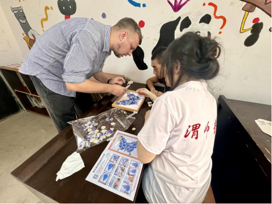团队始终将“暖心服务”作为行动指南,用真诚与耐心陪伴特殊儿童成长。面对特殊儿童的差异化需求,成员们坚持一对一指导,在非遗课程中手把手教孩子们绘制漆扇、创作青花瓷贴画;在户外活动中时刻关注孩子们的安全与状态,用细致关怀消除他们的紧张与不安。7月9日,外籍教师加入支教队伍,与团队成员共同开展青花瓷贴画课程,中外教师默契配合,让孩子们在跨文化互动中感受非遗魅力,这样的创新实践正是团队勇于担当、积极作为的体现。