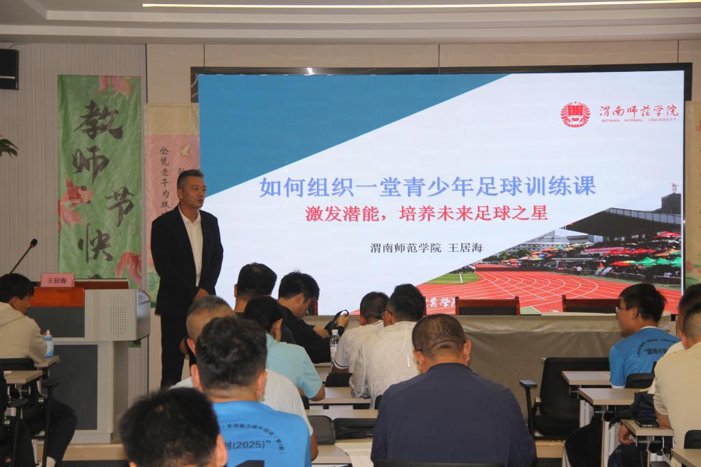 本次培训紧扣校园足球教学与实践需求,围绕“足球竞赛规则与裁判法”“青少年足球训练课程设计”和“校内足球竞赛组织”等专题展开,特邀省内外多位专家授课。西安体育学院席海龙教授解析了“新时代校园足球发展战略”,大连大学冯爱民教授就“足球教学训练核心素养”进行深入讲解,西安市铁一中学程辉老师则系统阐述了青少年足球“启蒙、基础、发展、提高过渡”四个阶段的训练要求。