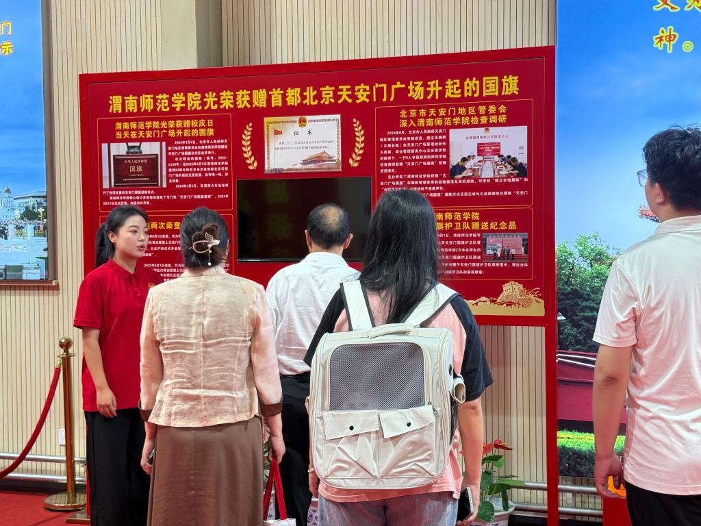 讲解过程中,志愿者围绕渭师与国旗的“四个故事”、学校国旗护卫队发展历程、历年爱国主义教育活动成果等内容,生动讲述国旗的诞生故事、象征意义,以及学校学子用青春守护国旗、践行爱国初心的鲜活案例。同时,结合展馆内的实物展品、影像资料,带领新生回顾学校在爱国主义教育、国防教育等方面的特色成果,让新生在报到之初就深刻感受学校浓厚的家国情怀与精神底蕴。