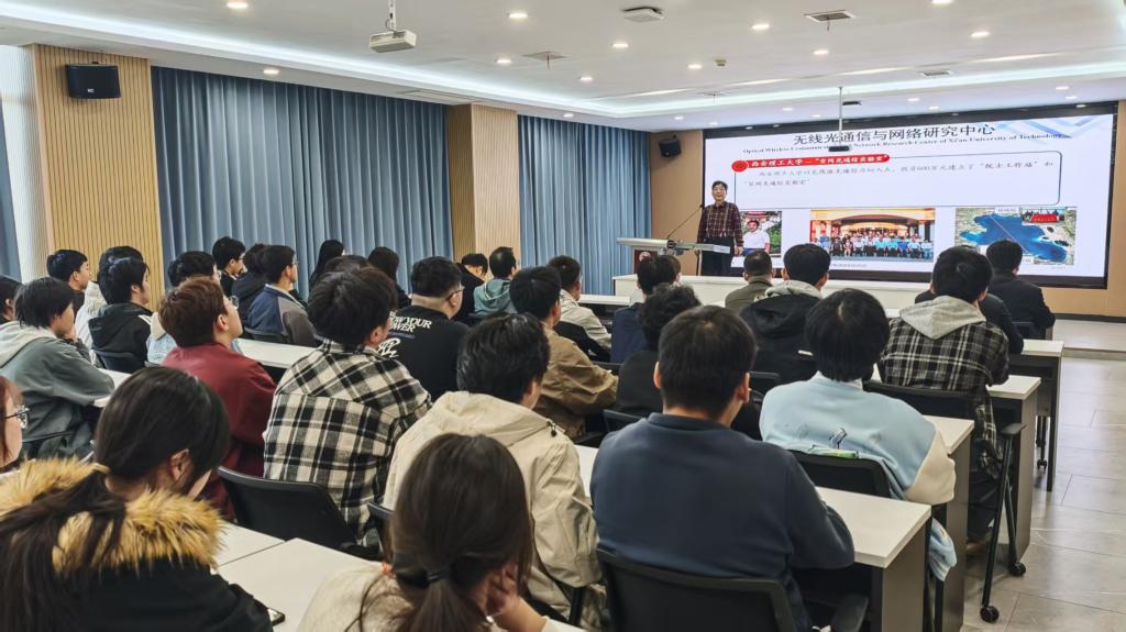 报告会上,柯熙政教授首先分享了自己从求学到教书育人的心路历程,系统地梳理了光电技术的发展脉络,并深入解析了通信原理与实现方法。他借助专业课件和细致讲解,帮助学生厘清光电通信的关键知识,明晰射频通信与光电通信的差异,为后续的专业学习奠定了坚实基础。
