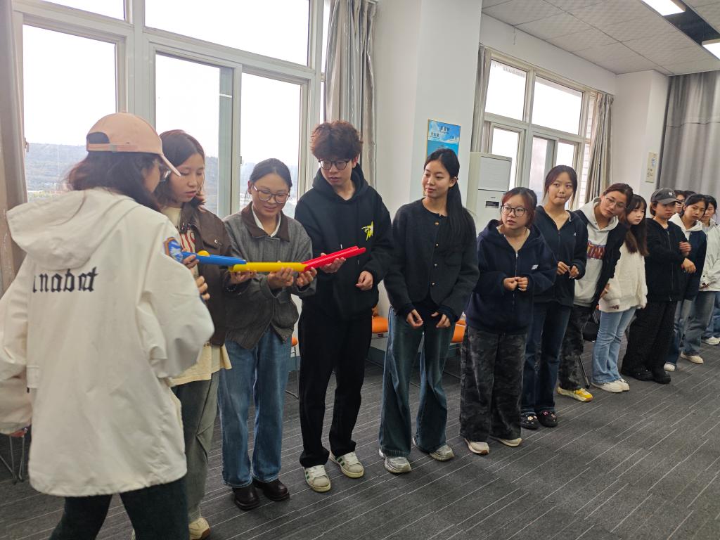 活动开始,程芮强调,心理委员是学校心理健康教育工作体系中不可或缺的重要力量,是同学们身边“看得见、找得到、信得过”的心理支持伙伴。希望通过此次团体辅导,帮助心理委员们掌握实用的心理知识与技能,增强自身心理调适能力,同时提升团队凝聚力,为后续班级心理健康工作的开展奠定坚实基础。并向心理委员介绍了团体心理辅导活动的含义、特点、目的及活动规则。在介绍完团体心理辅导的核心信息后,程芮带领心理委员进行了“名字接龙+特质标签”“松鼠和大树”“数字小游戏”“珠行万里”“表情传递”、团队文化共创活动,现场氛围热烈,笑声不断。