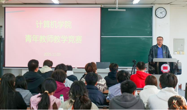 11月3日下午,计算机学院在1501教室举办青年教师教学竞赛。比赛邀请校级教学督导张郭军、学院院级督导陈莉萍、葛莉、周碧英、贾晓强共同组成评审团,学院学生代表到现场观摩比赛。竞赛由学院副院长哈渭涛主持,于占豪、雷思思、胡茶升、殷娟娟四位青年教师同台竞技,展教学风采。