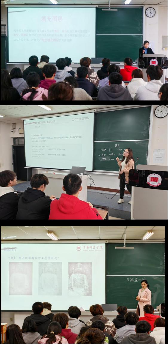 比赛现场,参赛教师精神饱满、教态从容,通过多媒体演示、案例教学等方式展开激烈追逐。于占豪在《数字摄影摄像》课程中,通过使用单反相机演示,让同学们真切地感受到曝光三要素对摄影摄像的重要性;雷思思在《数字处理图像》课程中,带领学生利用纯色填充图层将现代照片制作出复古效果,体验PS软件带来操作的乐趣;胡茶升在《Python语言程序设计》教学中以“集合”为重点,围绕集合的创建,集合元素的添加、删除和清空为框架展开授课;殷娟娟在通过《数字图像处理》中一系列的实例和实践操作,展开对灰度直方图的讲解。四位参赛教师结合学科特色与课程实际,从课程思政融入、前沿技术解读、实践案例设计等角度出发,打造各具特色的教学课堂,赢得阵阵掌声。