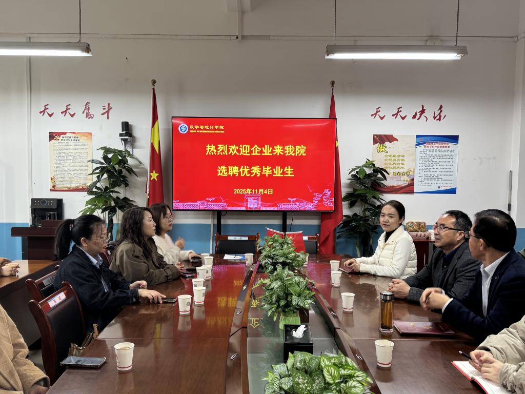 11月4 日,数学与统计学院在学院会议室举办2026届毕业生专场招聘会暨共建大学生就业基地签约仪式,邀请中国银行远程银行中心、渭南蓝云科信息科技有限公司来学院选聘优秀毕业生。学院党总支书记苟建超、院长陈斌、党总支副书记张小苗、毕业班辅导员及部分2026届毕业生参加招聘会。