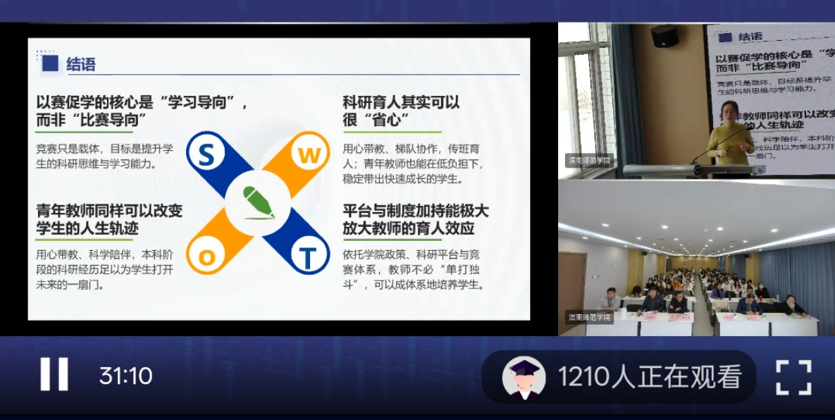 郑小辉教授带来了题为《以赛促学:青年教师指导本科生科研创新的实践与思考》的精彩报告。郑教授结合自身丰富的指导经验,深入浅出地分享了如何通过竞赛驱动,有效激发本科生的科研兴趣与创新潜能,以及青年教师在其中的角色定位与指导策略。报告内容详实、案例生动,引发了与会者的深度共鸣与思考。