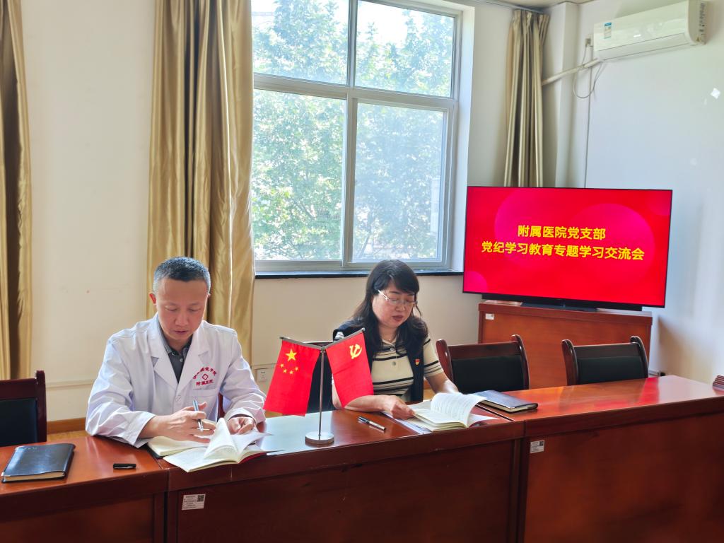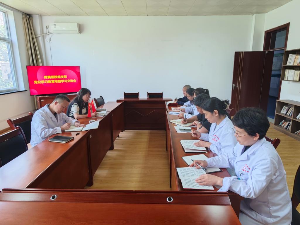 5月7日上午,附属医院党支部在医院三楼党员活动室开展党纪学习教育专题学习交流会。附属医院班子成员及党支部全体党员同志参加,会议由党支部书记王雅蓉主持。