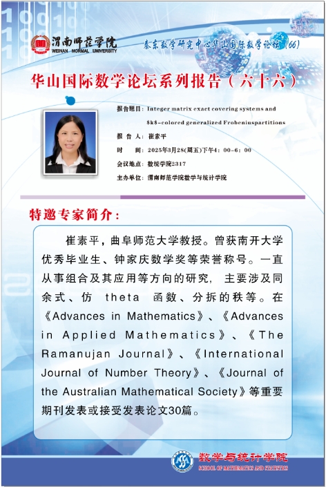 3月28日下午,数学与统计学院邀请曲阜师范大学钟家庆数学奖获得者崔素平教授为师生带来一场题为“Integer matrix exact covering systems and $k$-colored generalized FrobeniusPartitions”的学术报告。报告会由院长陈斌主持,数论与模形式团队、青年博士教师与数学专业的学生参加本场报告。