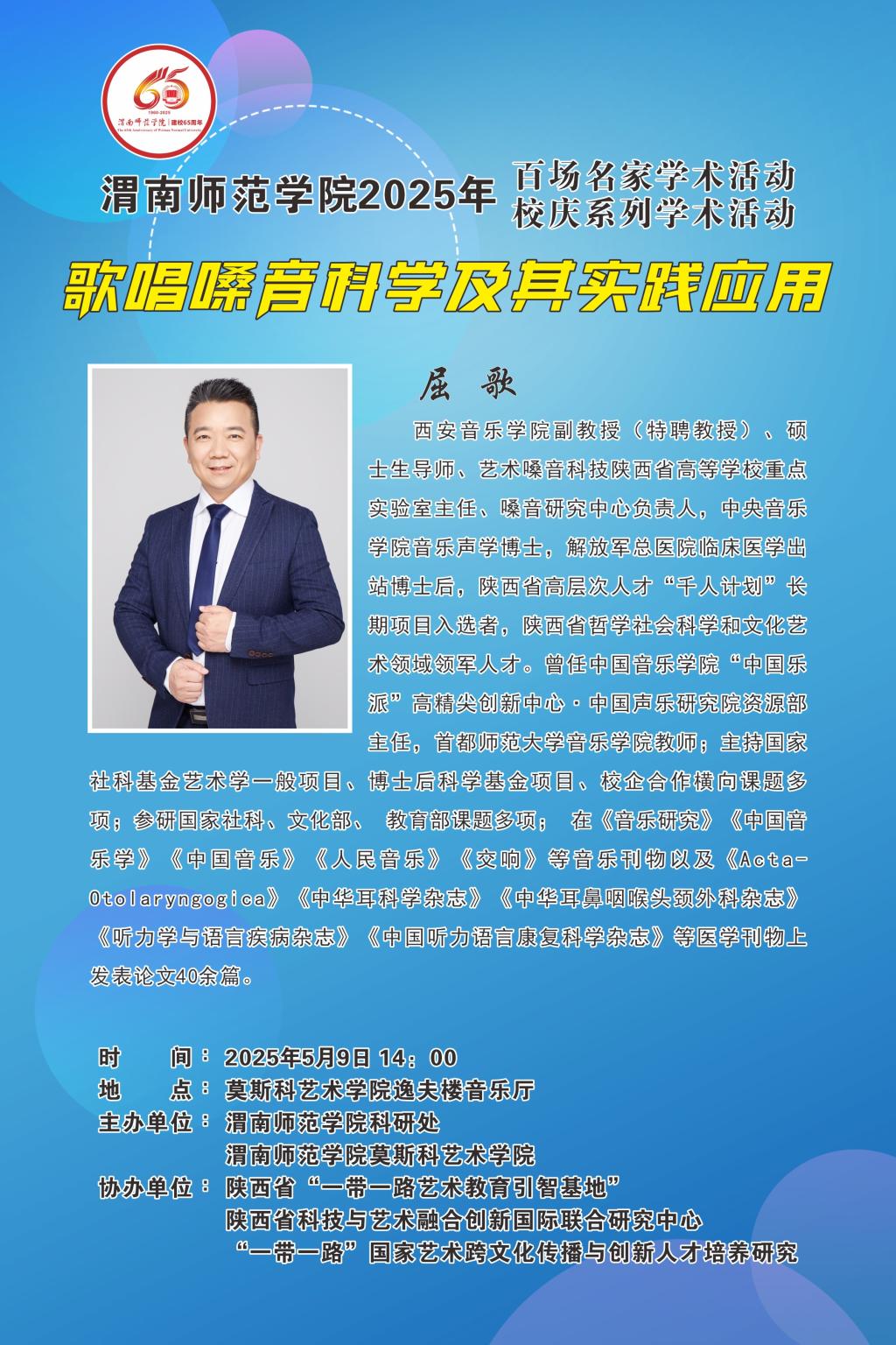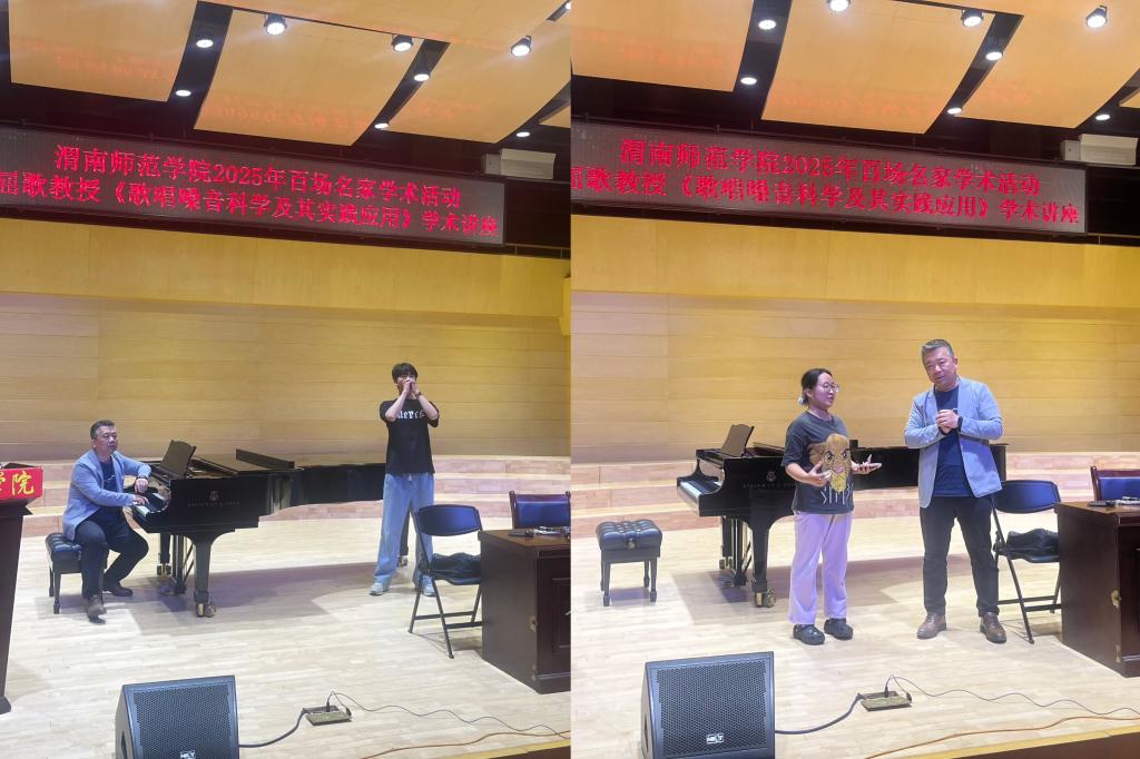 5月9日下午,莫斯科艺术学院特邀艺术嗓音科技陕西省高等学校重点实验室主任、嗓音研究中心负责人屈歌教授为师生作《歌唱嗓音科学及其实践应用》学术讲座,学院音乐学、学前教育专业师生共计200人参加。由莫斯科艺术学院副院长梁卫民主持。
