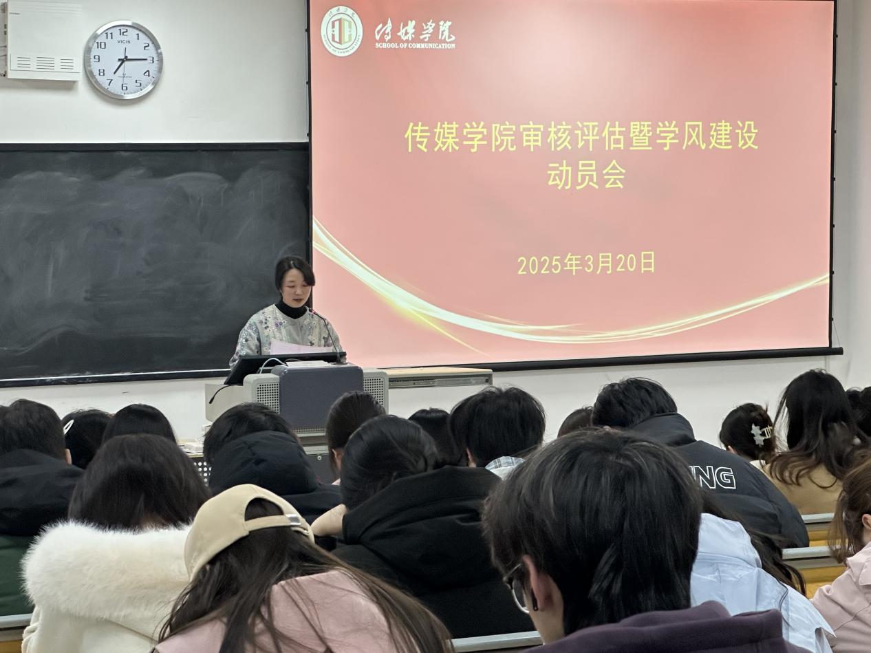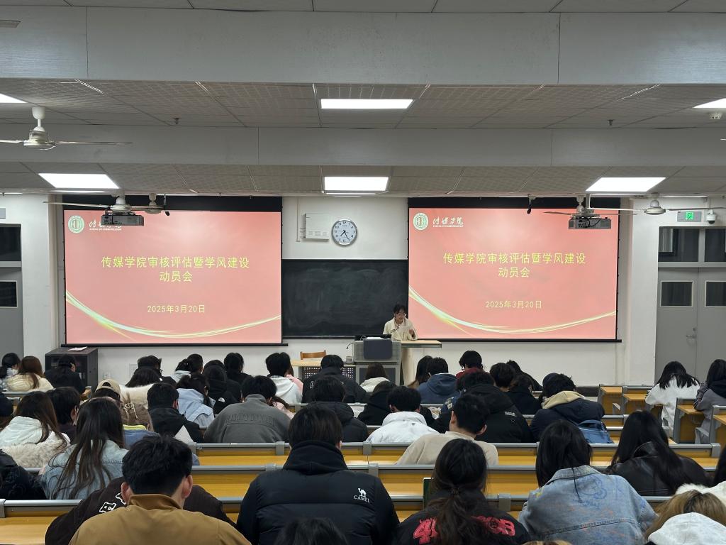 3月20日晚,传媒学院召开本科教育教学审核评估暨学风建设动员会,院长曹熙斌,党总支副书记周双,教师代表,班团干部,入党积极分子,奖助学金获得者等200余名师生参会,会议由副院长侯君奕主持。
