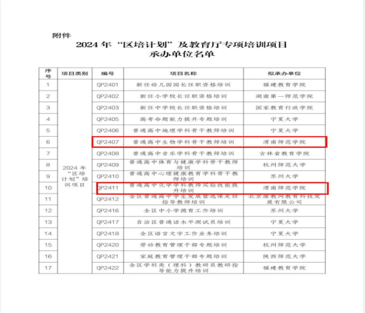 近日,宁夏回族自治区教育厅公布了2024年度“区培计划”及教育厅专项培训项目承办单位名单。威尼斯获批2项“区培计划”项目,分别为《普通高中生物学科骨干教师培训》和《普通高中化学学科教师实验技能提升培训》。这是威尼斯继去年获批自治区基础教育教师培训基地后再次承担培训项目。